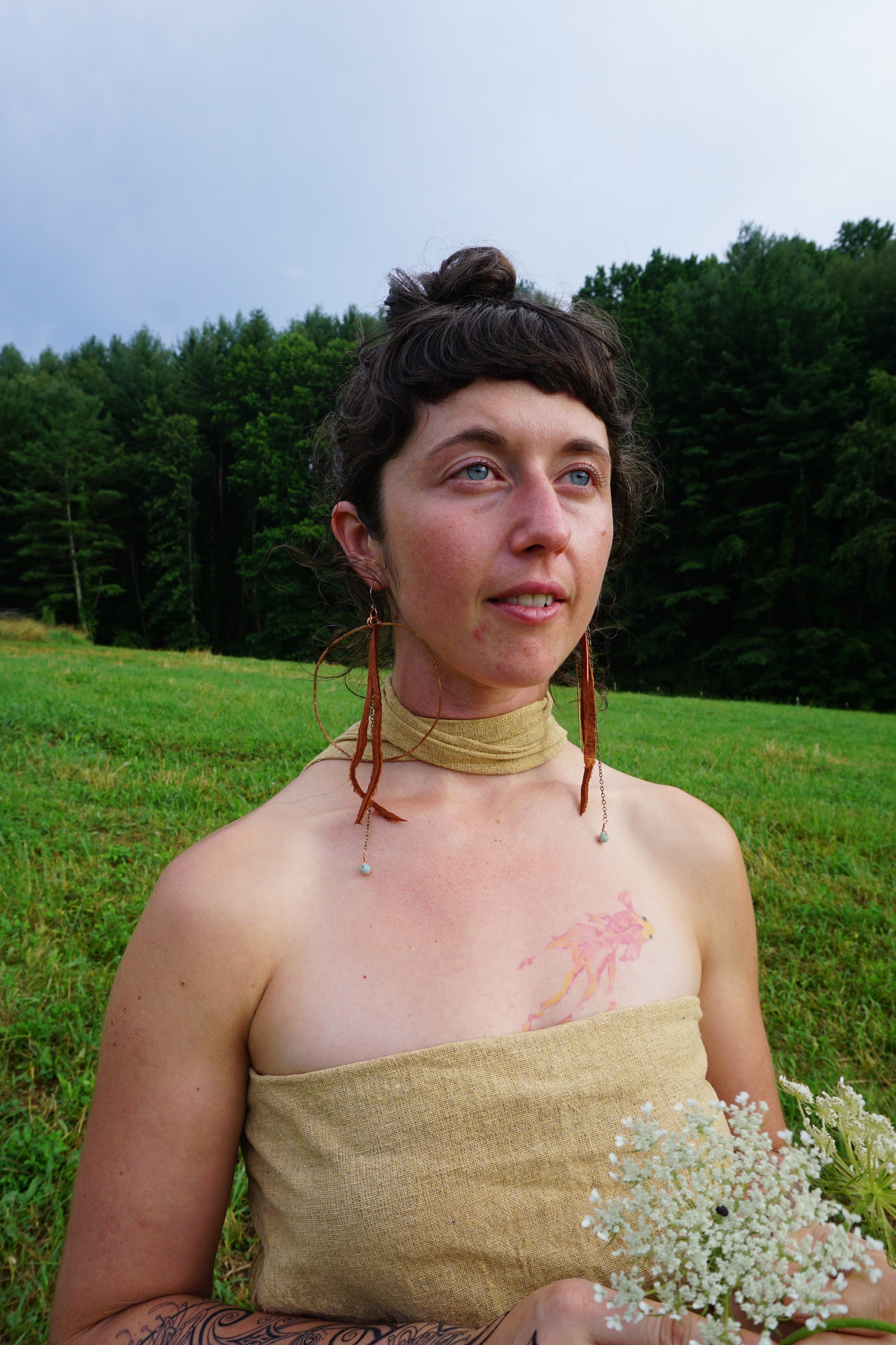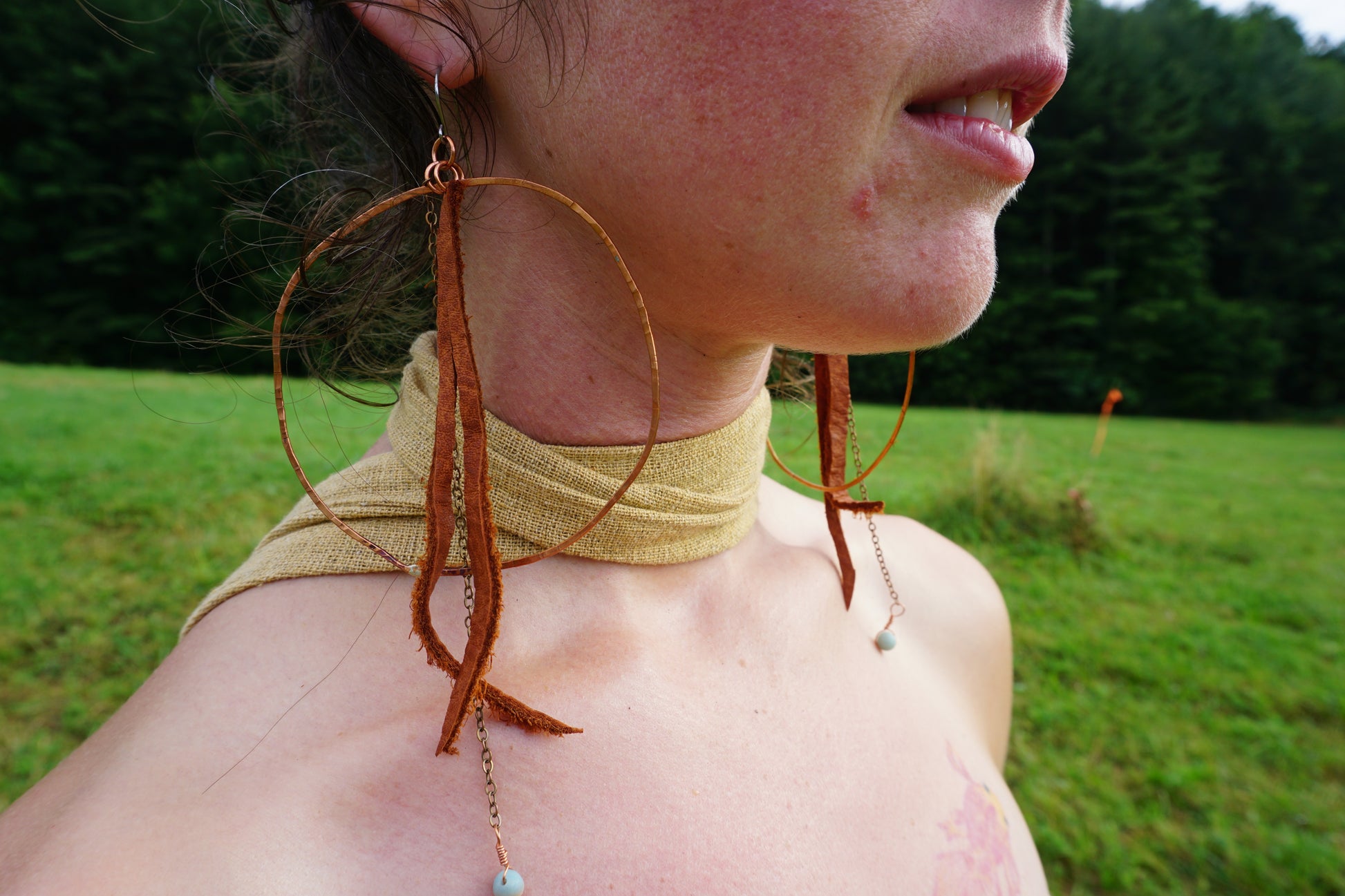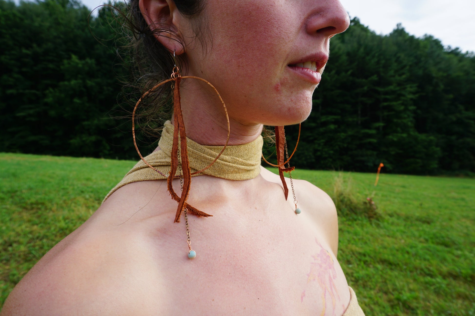 A handmade earring style from our in~house jewelry brand Bones of the Earth, these XL copper hoops are ultra lightweight & feature a copper chain & leather elements dangling from each hoop. This set features wire wrapped, delicate details throughout. All materials are high quality natural stones & hypoallergenic metals & ear wires | perfect for sensitive skin.