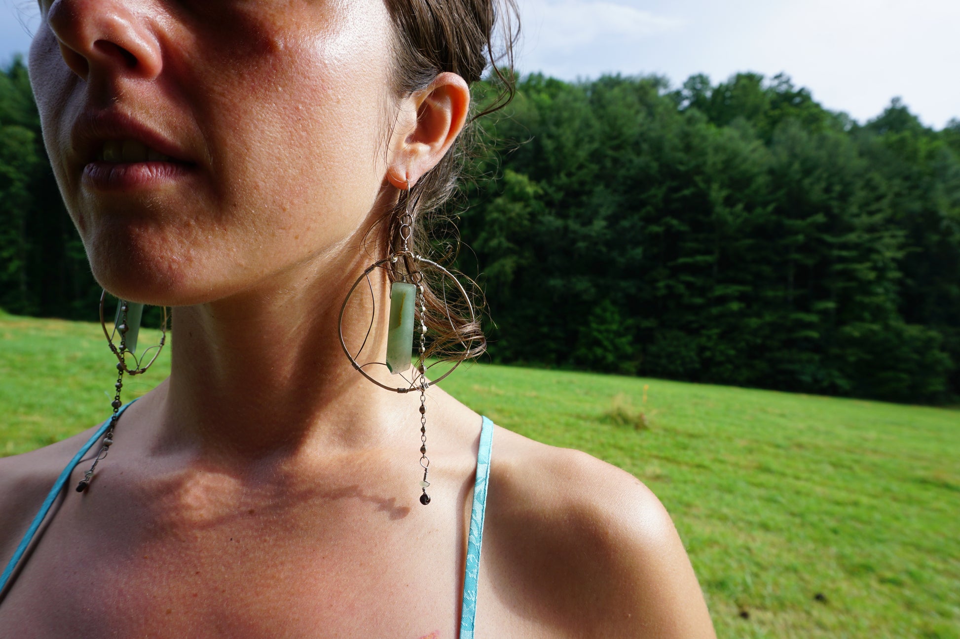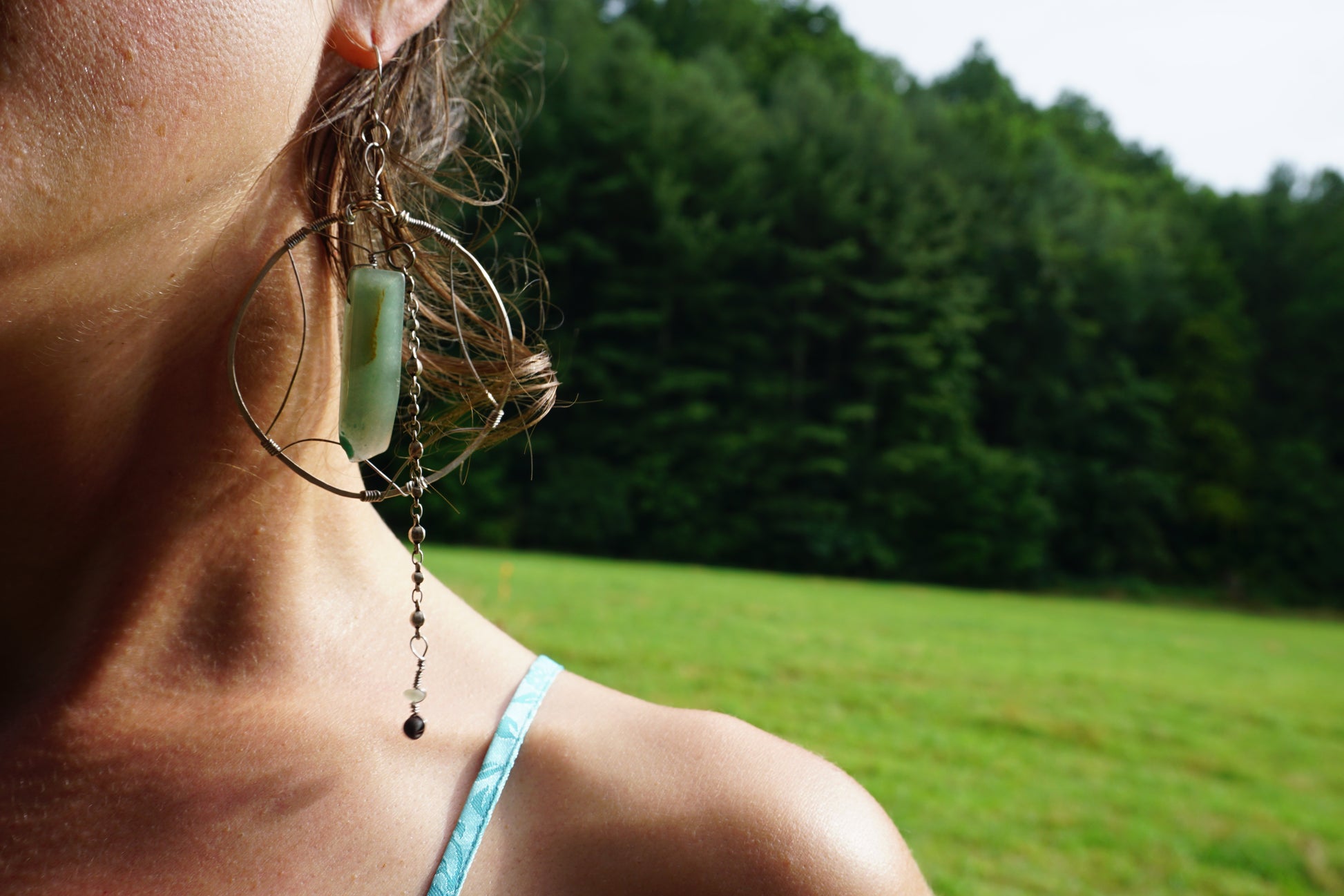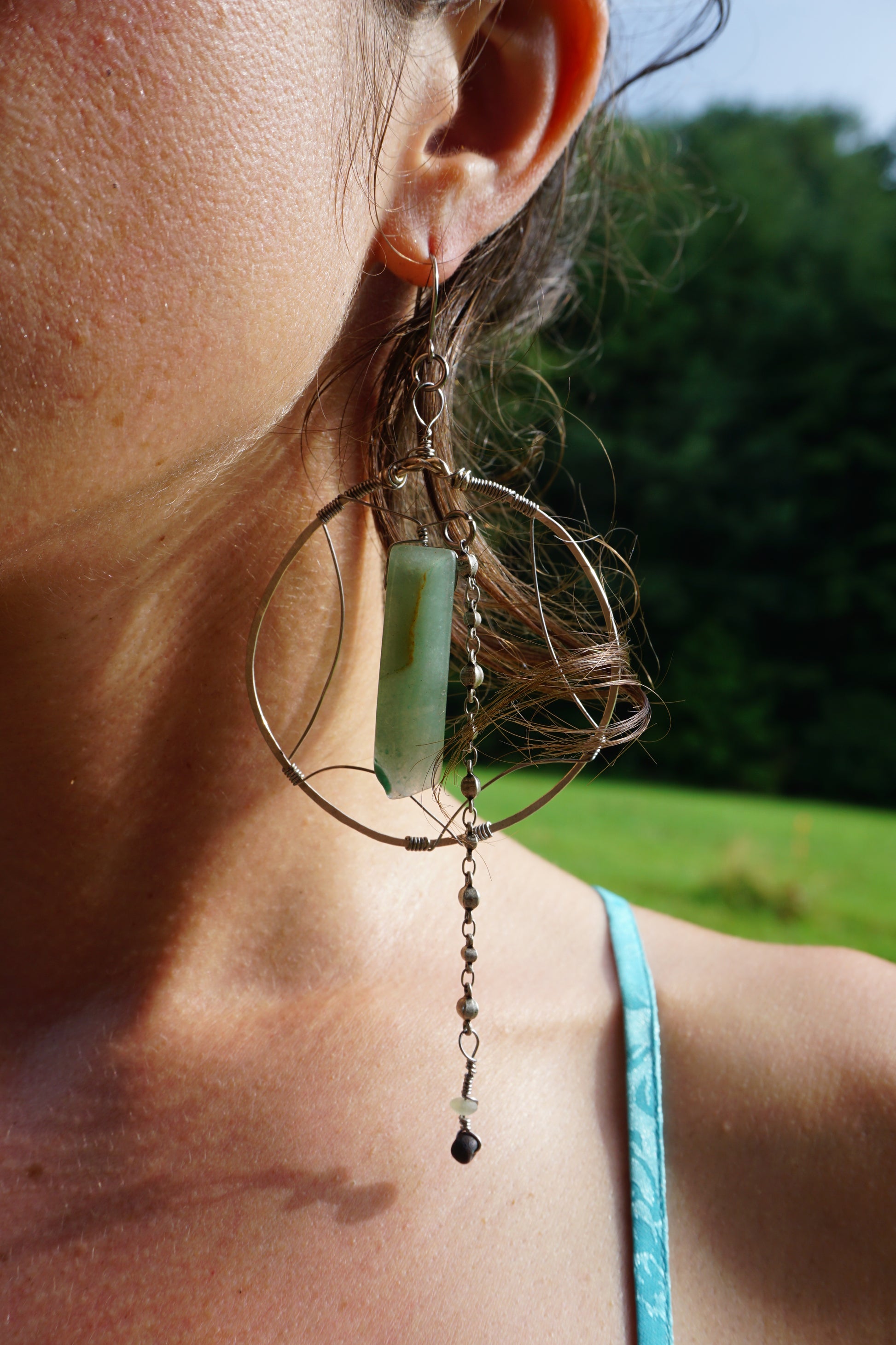 A signature earring style from our in~house jewelry brand Bones of the Earth, these aluminum hoops feature wire wrapped elements & a moroccan silver chain dangling from each hoop. This set features a pair of shining aventurine crystals ~ and wire wrapped, delicate details throughout. All materials are high quality natural stones & hypoallergenic metals & ear wires | perfect for sensitive skin.
