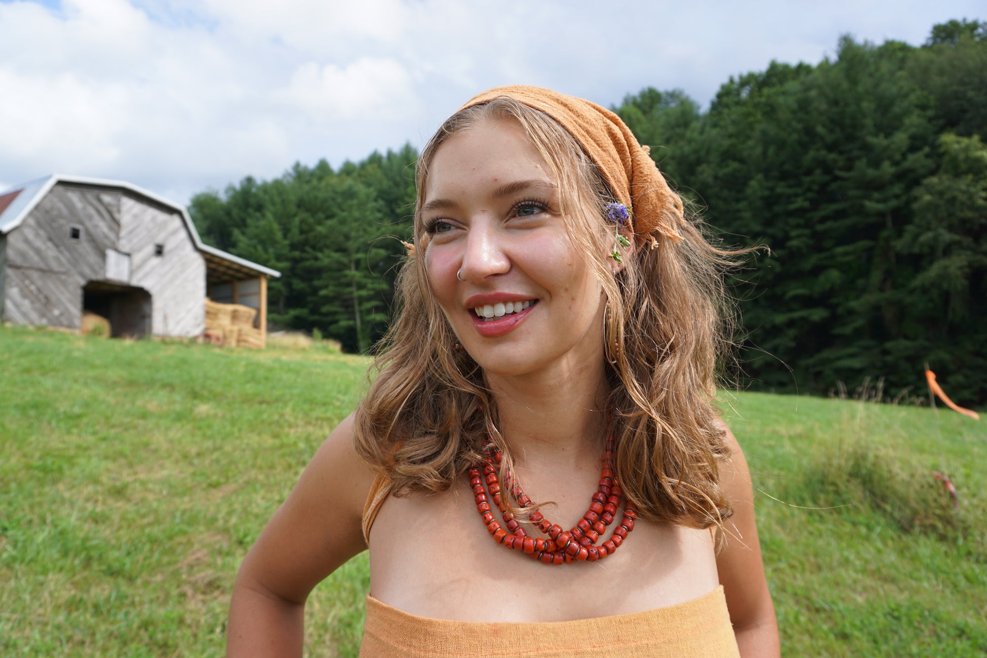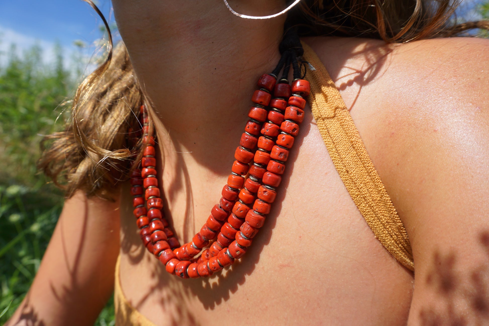 A handmade necklace from Nepal featuring Tibetan coral antique glass beads ~ crafted by tibetan women living in Nepal ~ rare and one of a kind ❤️ the closure is soft, wrapped in string / fabric and hooks onto a button.